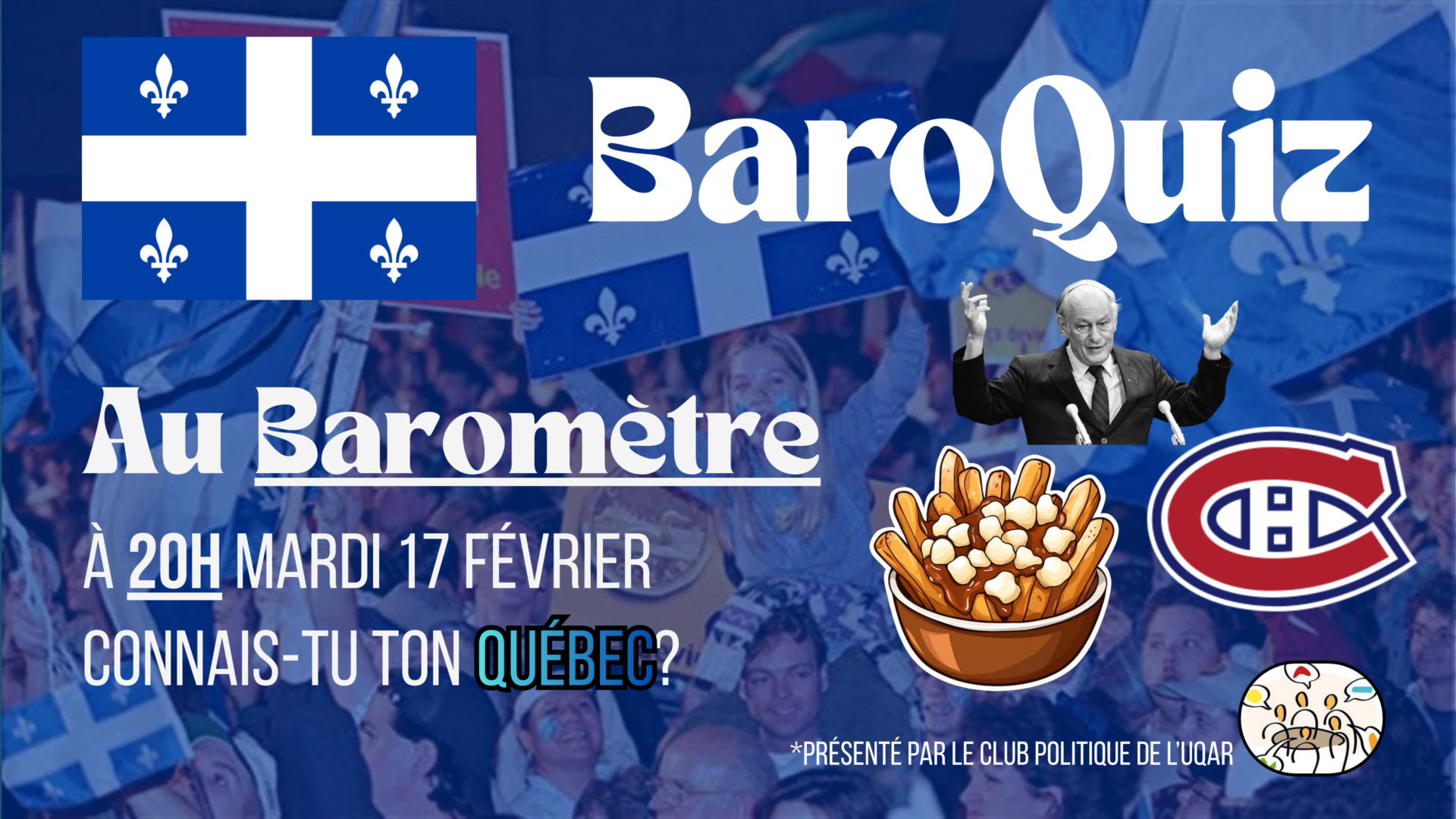 À la suite du dévoilement des résultats de la simulation référendaire qui s’est tenue au début février, le Club politique de l’UQAR au campus de Rimouski vous invite à un BaroQuiz sur le thème du Québec dès 20 h. ⚜️