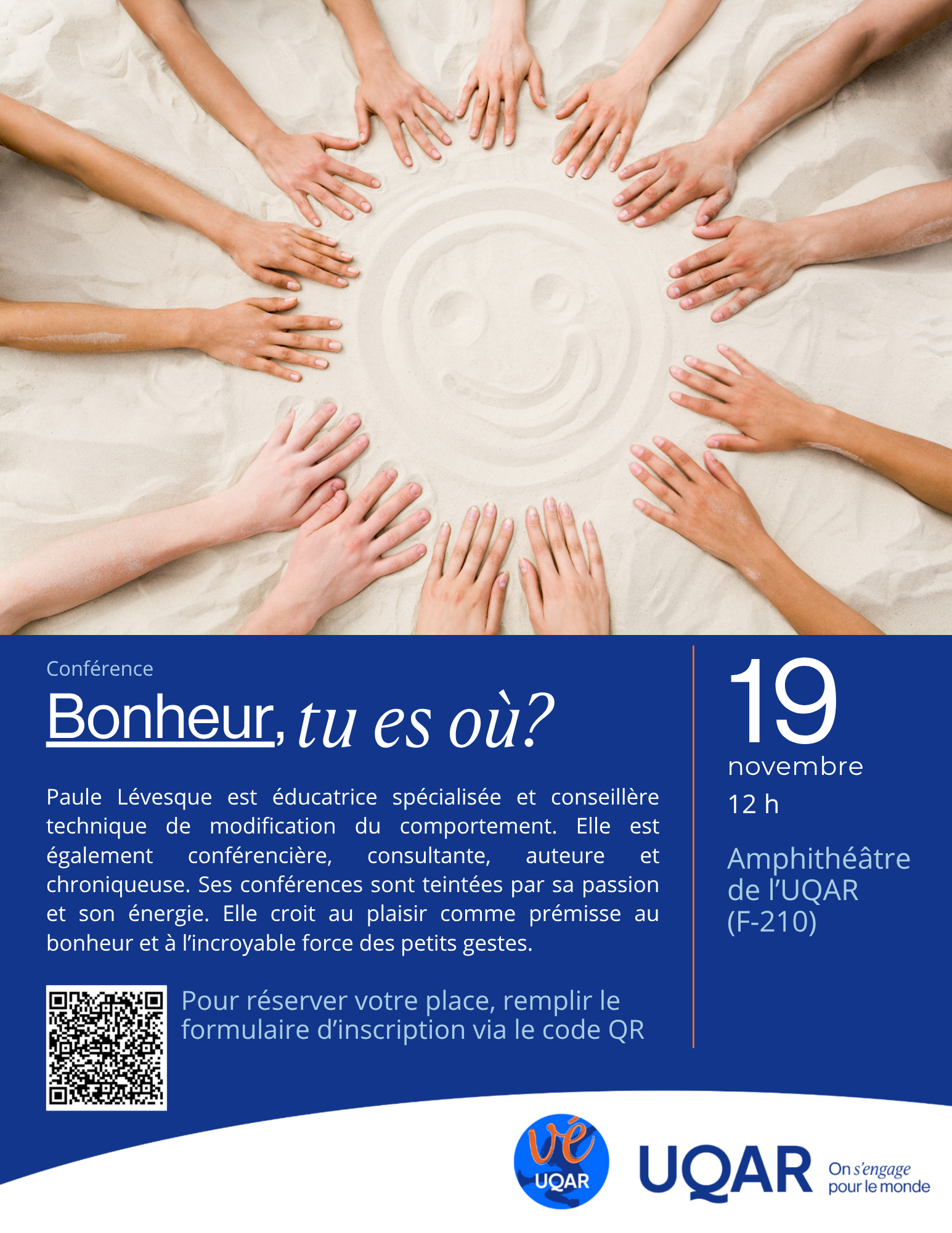 Le 19 novembre, à midi, à l’amphithéâtre du campus de Rimouski, nous vous invitons à la conférence « Bonheur, tu es où? » de la conférencière Paule Lévesque.