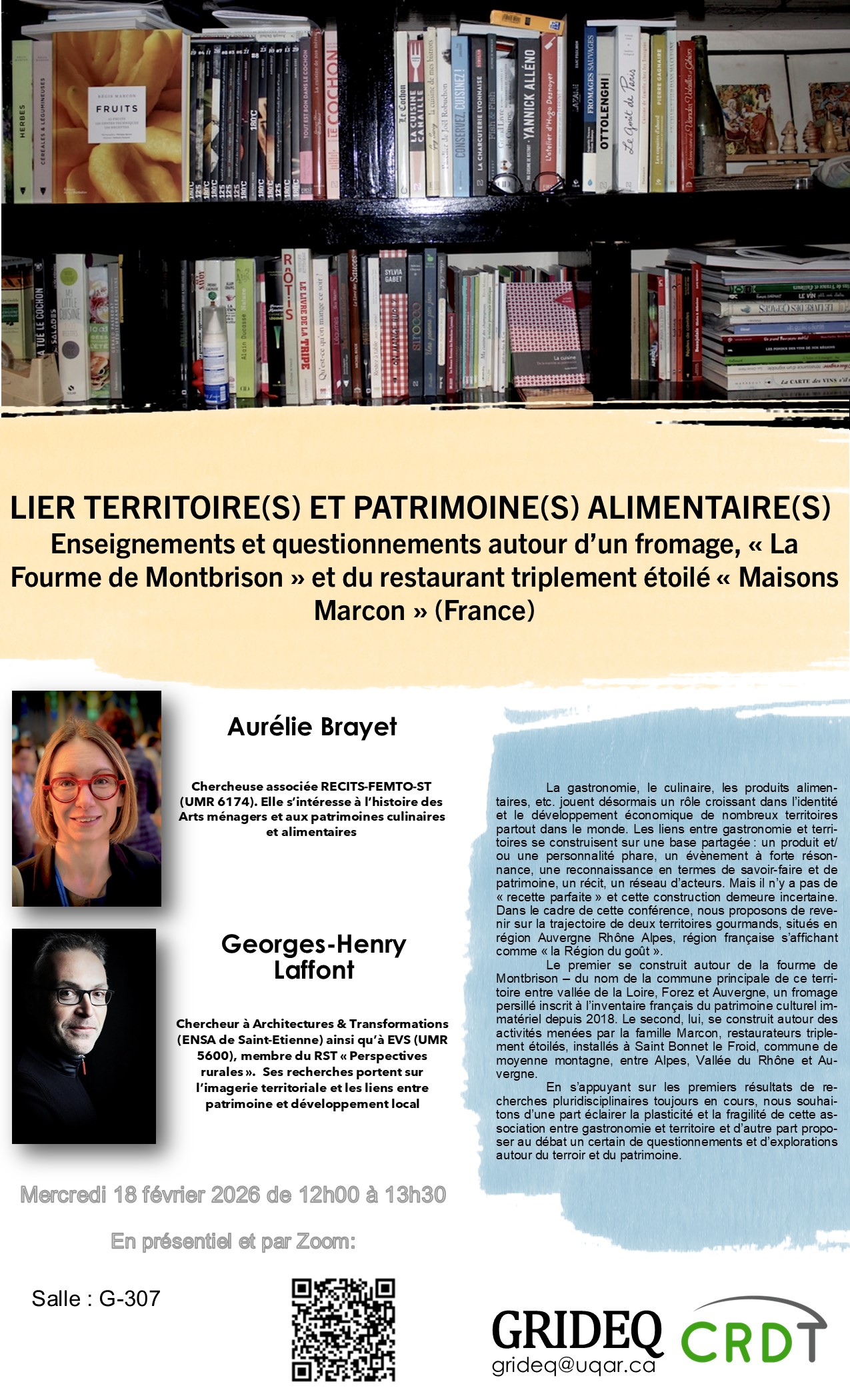 Le Groupe de recherche interdisciplinaire sur le développement régional, de l’Est du Québec (GRIDEQ), en collaboration avec le Centre de recherche sur le développement territorial (CRDT), vous invite à une conférence d’Aurélie Brayet, chercheuse associée RECITS-FEMTO-ST (UMR 6174), et de Georges-Henry Laffont, chercheur à Architectures & Transformations (ENSA de Saint-Etienne) ainsi qu’à EVS (UMR 5600), sous le thème : Lier territoire(s) et patrimoine(s) alimentaire(s) : enseignements et questionnements autour d’un fromage, « La Fourme de Montbrison » et du restaurant triplement étoilé « Maisons Marcon » (France).