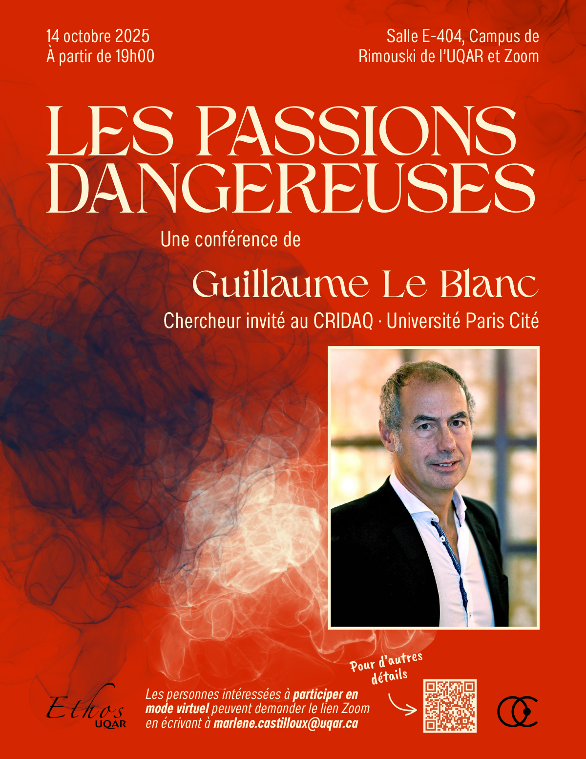 Le Groupe de recherche Ethos de l’UQAR en collaboration avec le Centre de recherche interdisciplinaire sur la diversité et la démocratie (CRIDAQ) de l’UQAM sommes ravis de vous inviter à une conférence qui se tiendra le 14 octobre prochain à 19 h en mode hybride. Pour cette occasion, nous aurons le privilège d’accueillir et d’entendre monsieur Guillaume Le Blanc, philosophe et professeur à l’Université Paris Cité. Ce sera l’occasion d’en apprendre un peu plus sur son récent ouvrage intitulé Les passions dangereuses.