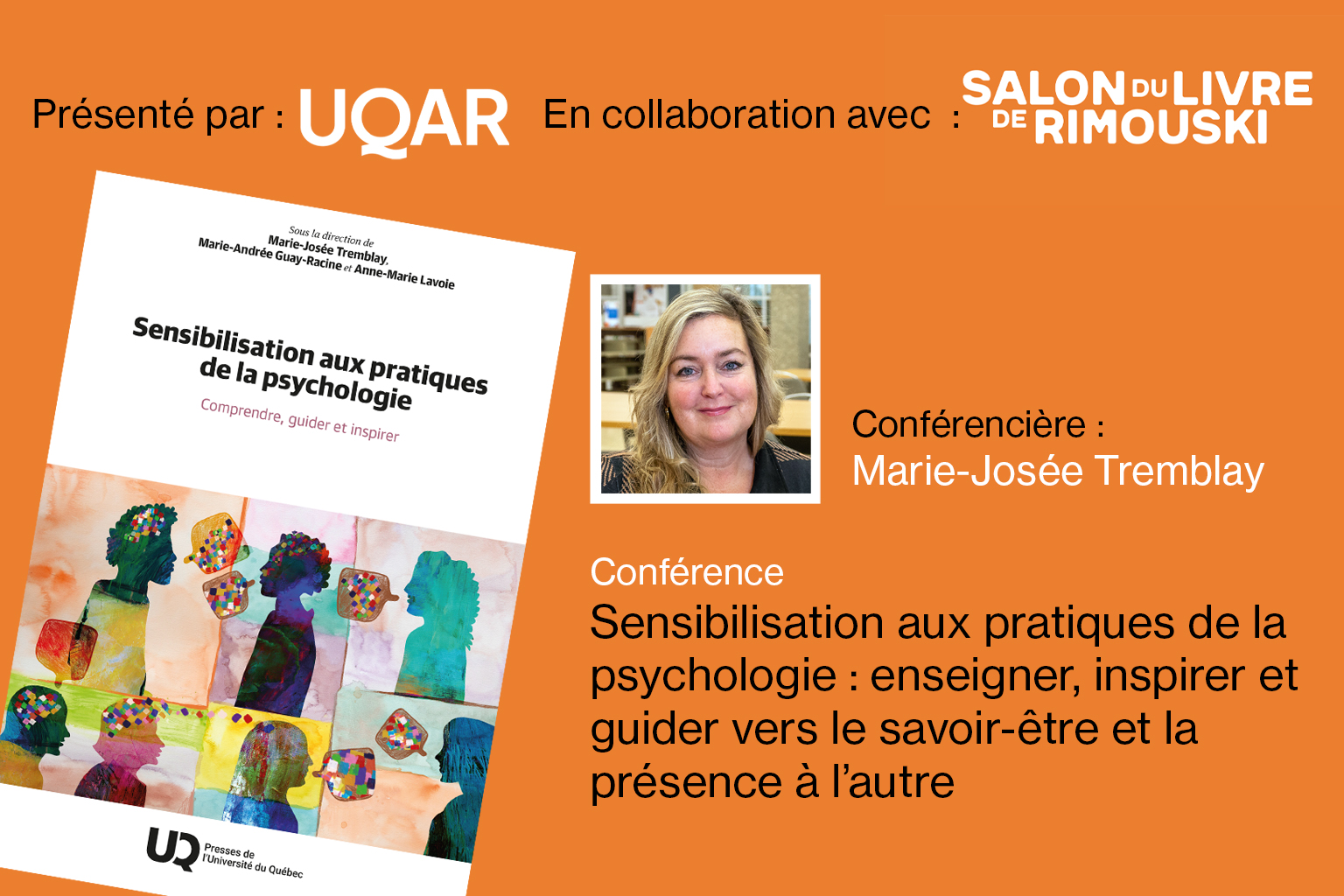 Résumé : En collaboration avec l’UQAR et les PUQ, la professeure-chercheuse et psychologue, Marie-Josée Tremblay, également directrice de la Clinique universitaire de psychologie de l’UQAR, propose la conférence : Sensibilisation aux pratiques de la psychologie : enseigner, inspirer et guider vers le savoir‑être et la présence à l’autre.