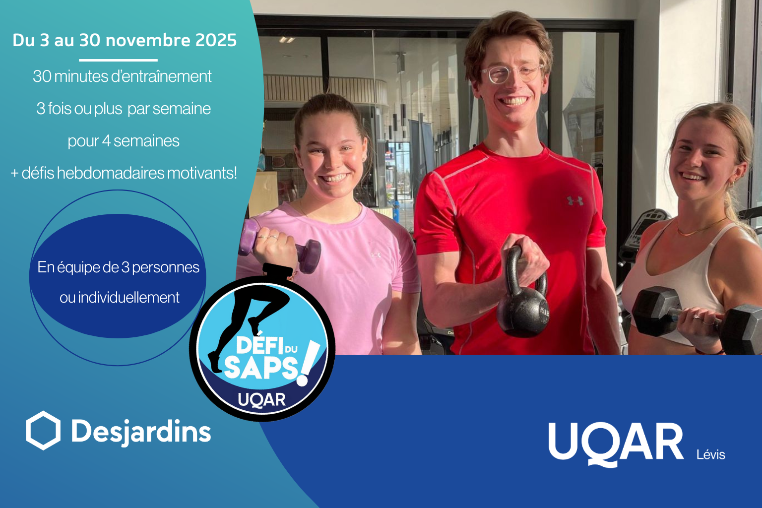 Nous vous invitons à réaliser un minimum de 30 minutes d’activités physiques, trois fois par semaine ou davantage, pendant une période de quatre semaines. Les séances d’entraînement (par exemple : badminton, cours en groupe, marche extérieure, salle d’entraînement, etc.) doivent être effectuées au Centre sportif du campus de Lévis ou en être directement rattachées.