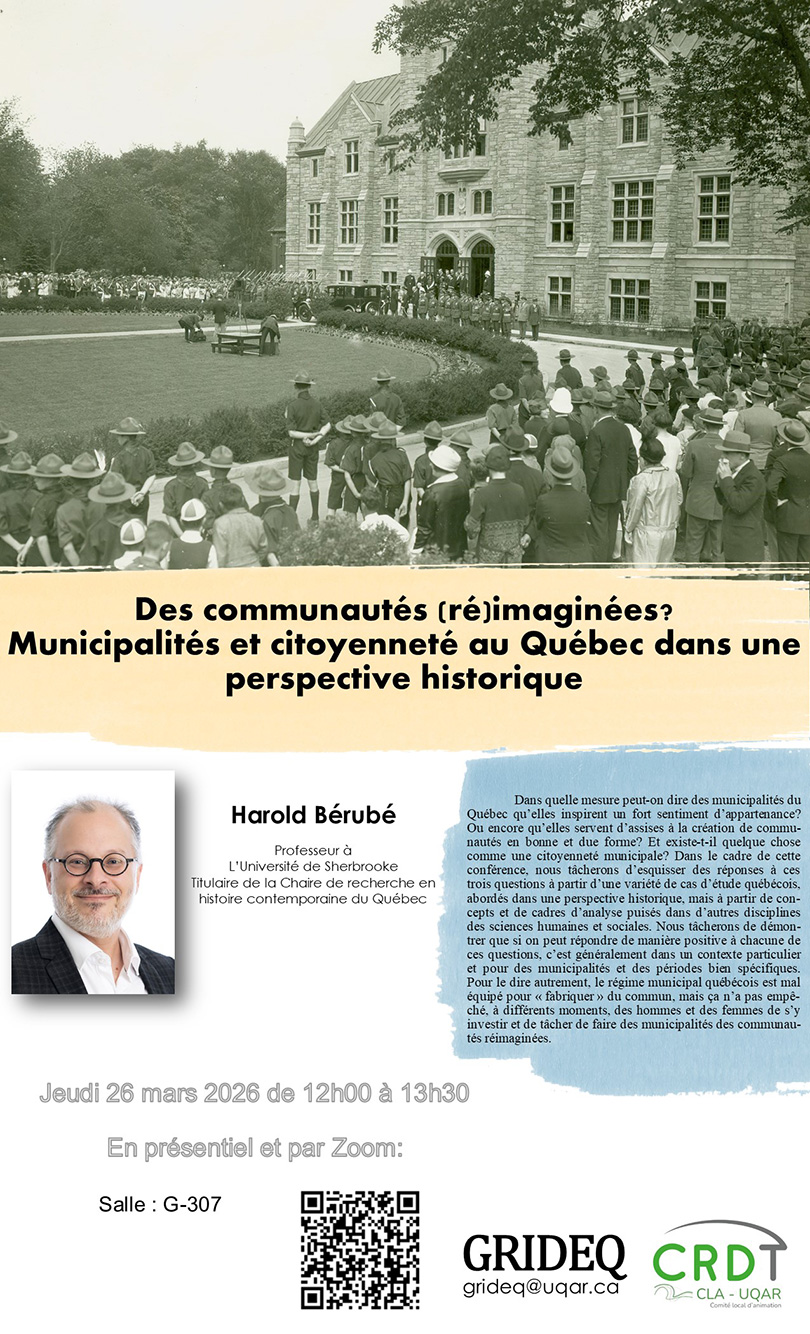 Le GRIDEQ, en collaboration avec le CRDT-UQAR, vous invite à une conférence de Harold Bérubé, professeur à l’Université de Sherbrooke et titulaire de la Chaire de recherche en histoire contemporaine du Québec, intitulée : Des communautés (ré)imaginées ? Municipalités et citoyenneté au Québec dans une perspective historique