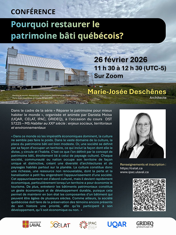 Le Groupe de recherche interdisciplinaire sur le développement régional, de l’Est du Québec (GRIDEQ) en collaboration avec le Centre de recherche Cultures – Arts – Sociétés (CELAT) et l’Institut du patrimoine culturel (IPAC) vous invite à une conférence de l’architecte Marie-Josée Deschênes, sous le thème: Pourquoi restaurer le patrimoine bâti québécois?