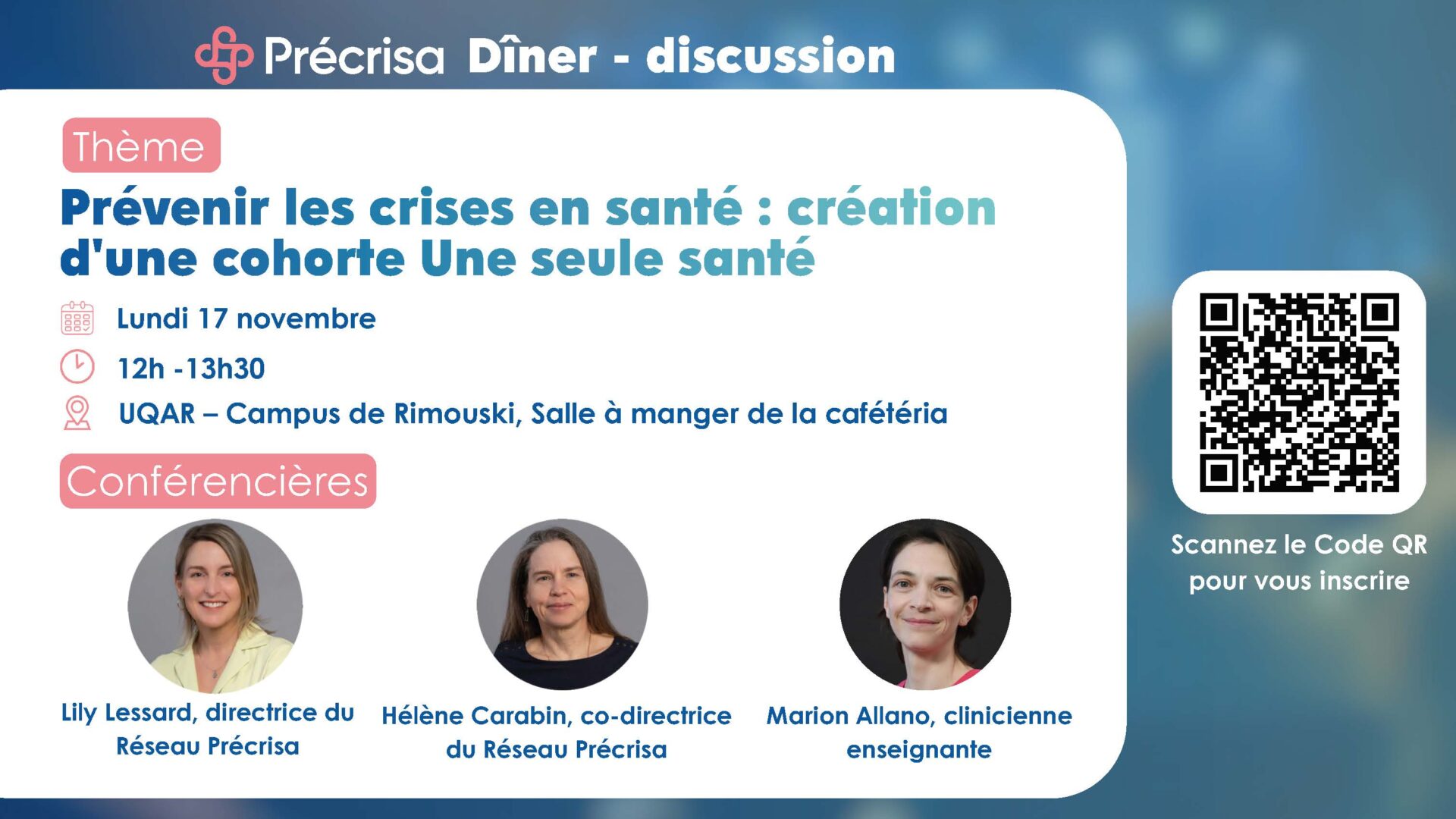 Inscrivez-vous maintenant (place limitées) : Dîner discussion Précrisa – Création d’une cohorte Une seule santé