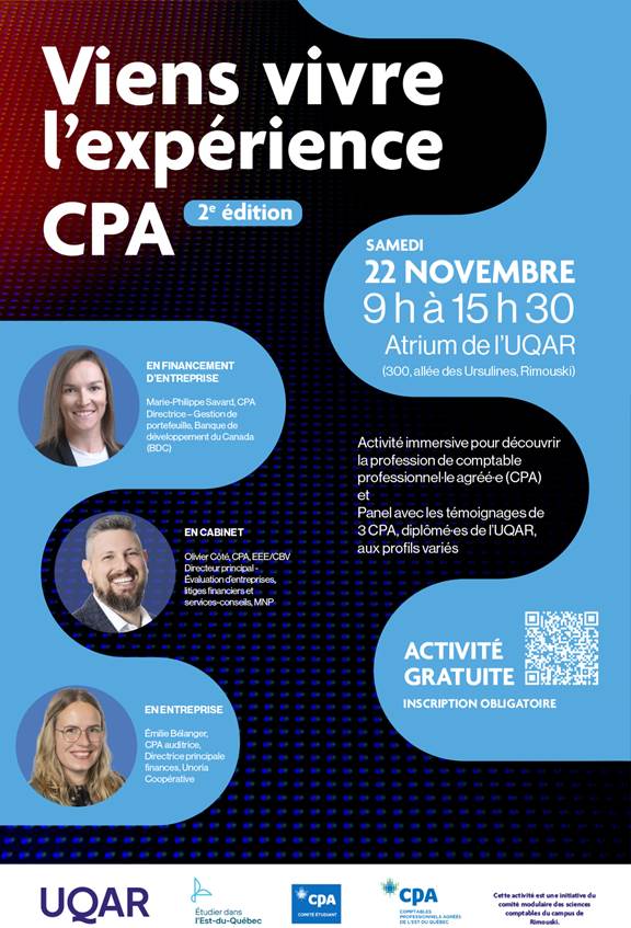 Cette activité est une initiative du comité modulaire des sciences comptables du campus de Rimouski de l’UQAR, grâce au soutien de divers services de l’UQAR, du Pôle régional en enseignement supérieur du Bas-Saint-Laurent, du comité étudiant CPA du campus de Rimouski et de l’Ordre des CPA du Québec.