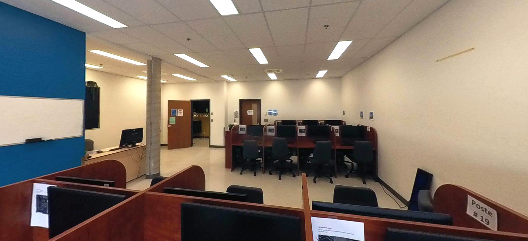 Salle offrant un environnement à faible distraction et de l’équipement informatique pour répondre aux besoins des étudiantes et étudiants avec des besoins particuliers.
