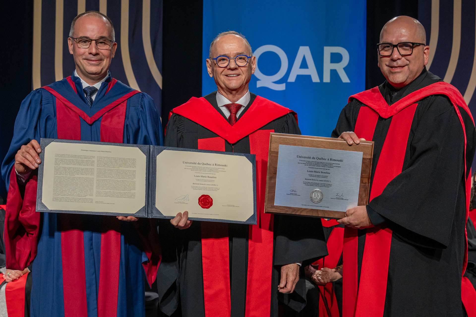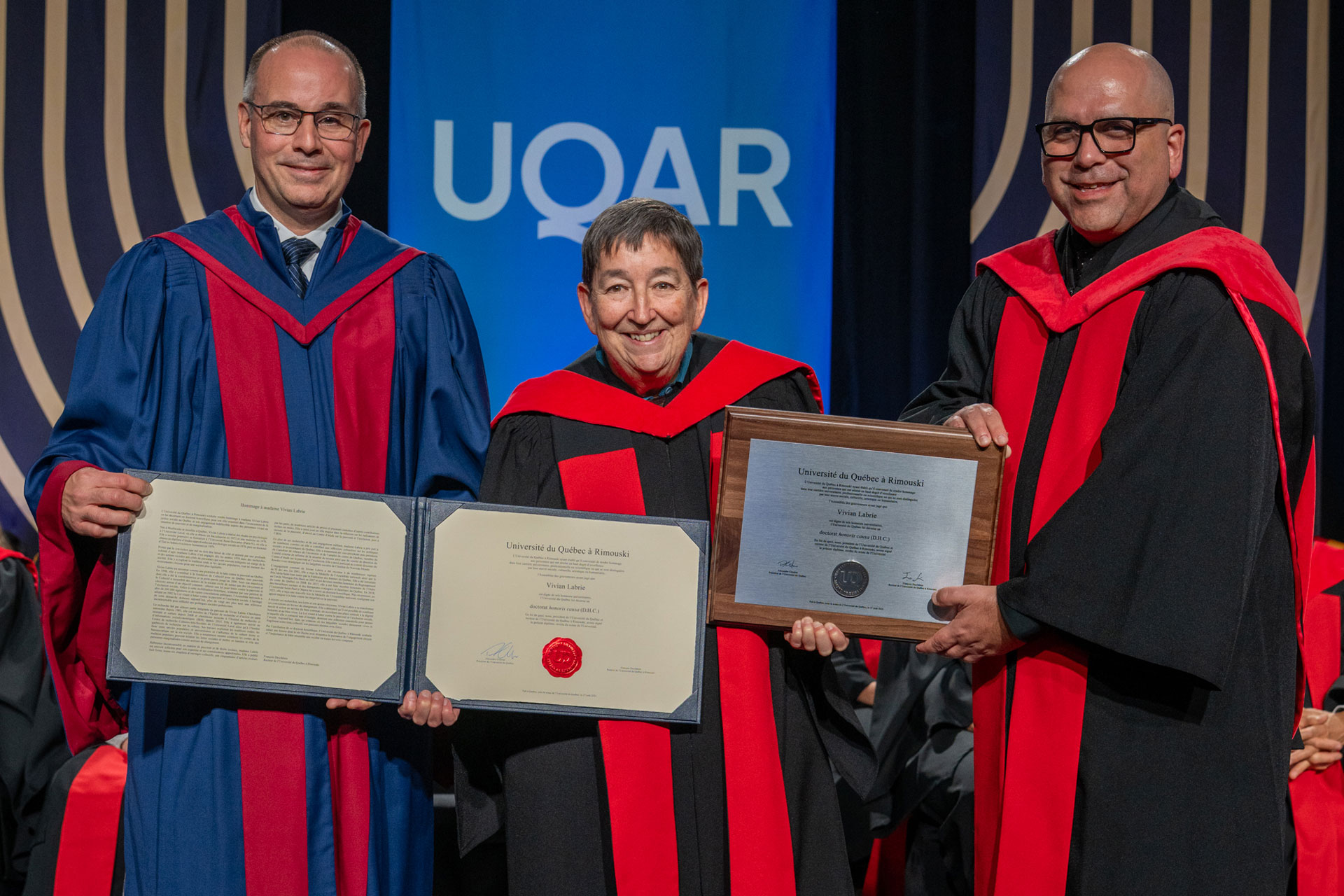 Lors de cette journée mémorable, deux doctorats honorifiques ont été remis à Vivian Labrie et à Louis-Marie Beaulieu. Vivian Labrie est reconnue comme une pionnière de la lutte contre la pauvreté au Québec. Elle s’est engagée dès les années 1970 dans des recherches et des actions sociales aux côtés de personnes souvent en marge de la société. Grâce à ses recherches, à ses écrits et à son action citoyenne, elle a su transformer ses convictions en leviers de changement.
