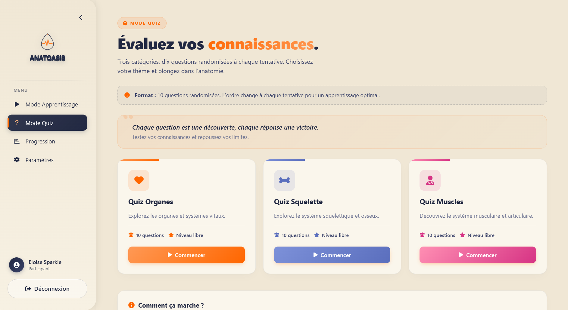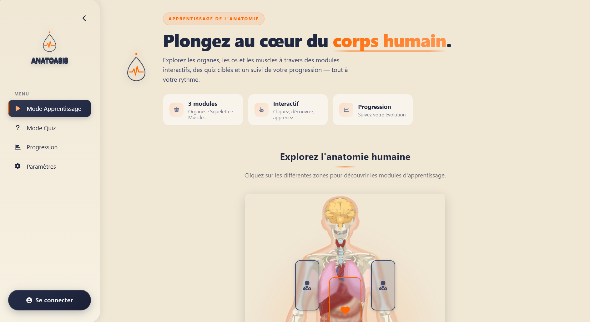 Pour répondre à ces limites, AnatOasis s’inspire des principes ayant fait le succès de Duolingo — apprentissage progressif, pratique régulière et motivation par le jeu — afin de proposer une approche plus engageante de l’anatomie humaine. La plateforme met à disposition des contenus interactifs annotés, un système de quiz dynamique ainsi qu’un suivi personnalisé des progrès, le tout entièrement en français.