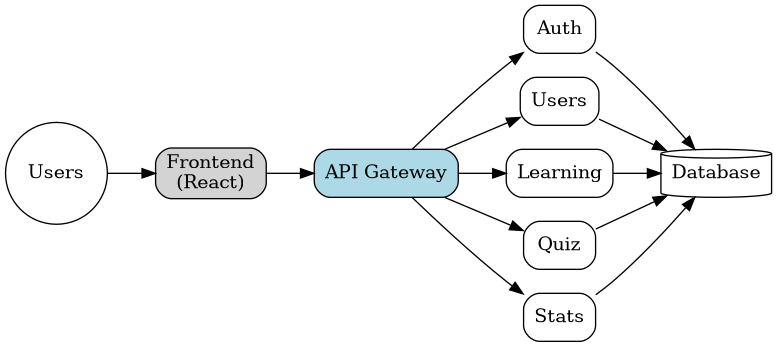 L’application repose sur une architecture microservices composée de cinq services indépendants — Learning, User, Auth, Quiz et Stats — interconnectés via une API Gateway REST. Le front-end, développé en React, offre une interface intuitive et responsive, adaptée à une utilisation sur ordinateur, tablette et mobile.
