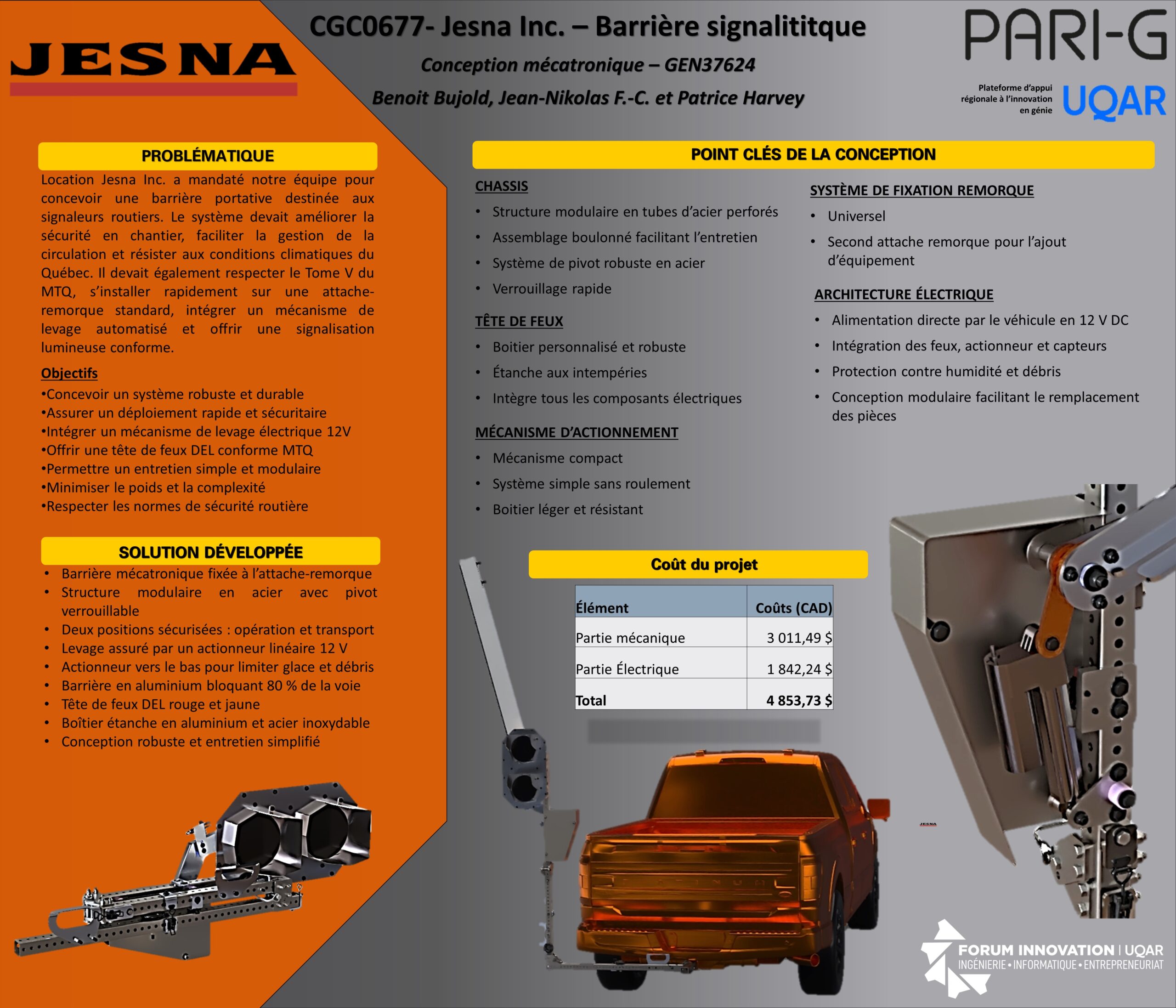 Il s’agit du projet effectué dans le cadre du cours GEN37524. Notre équipe était chargée de développer une barrière mobile pour signaleurs routiers étant adaptable à différents types de véhicules et pouvant être rangée de manière ergonomique dans la cabine du véhicule tout en étant de bonne qualité, solide et pouvant résister aux conditions québécoises. Elle devait aussi respecter les normes du MTQ pour pouvoir être légale sur les routes.