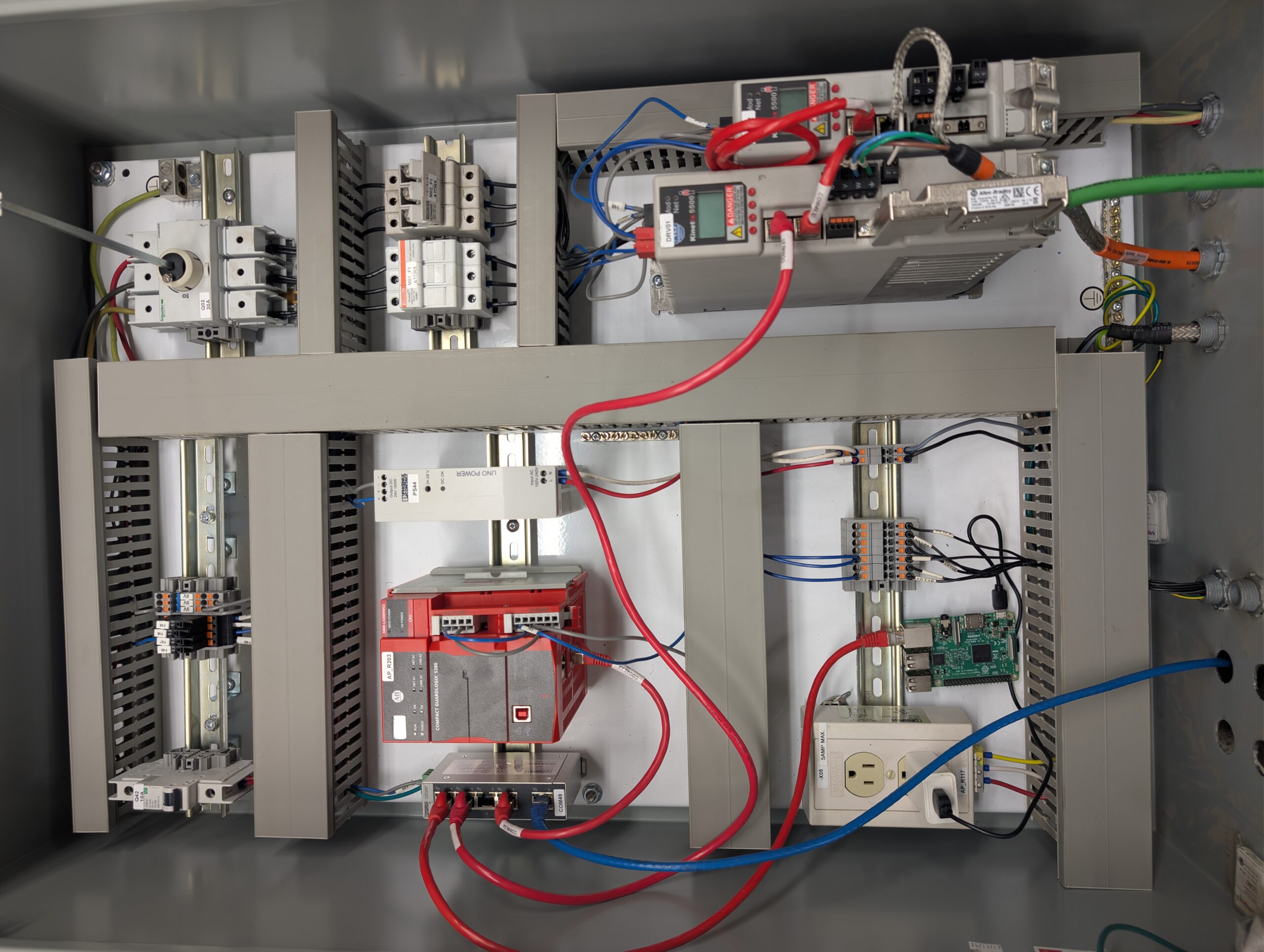 L’équipe a conçu un prototype à échelle réduite de type SCARA, piloté par un automate CompactLogix 5380 et deux servo-drives Kinetix 5500. L’interface de commande repose sur une manette PlayStation 4 connectée via Bluetooth à un Raspberry Pi, qui transmet les consignes de déplacement à l’automate via Ethernet/IP. Cette interface a permis de réaliser rapidement les tests en atelier sans nécessiter d’interface industrielle complexe.