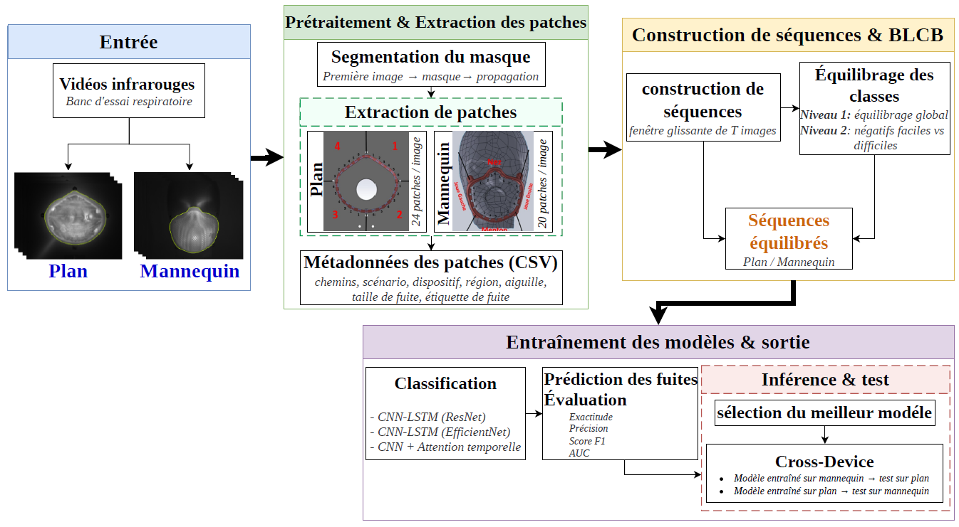 Le système proposé repose sur une approche spatio-temporelle à l’échelle de patches. Les données utilisées proviennent d’une base de vidéos infrarouges collectée par notre équipe de recherche à l’aide d’un banc d’essai respiratoire reproduisant des cycles de respiration et des scénarios de fuite contrôlés sur un modèle plan et un mannequin .