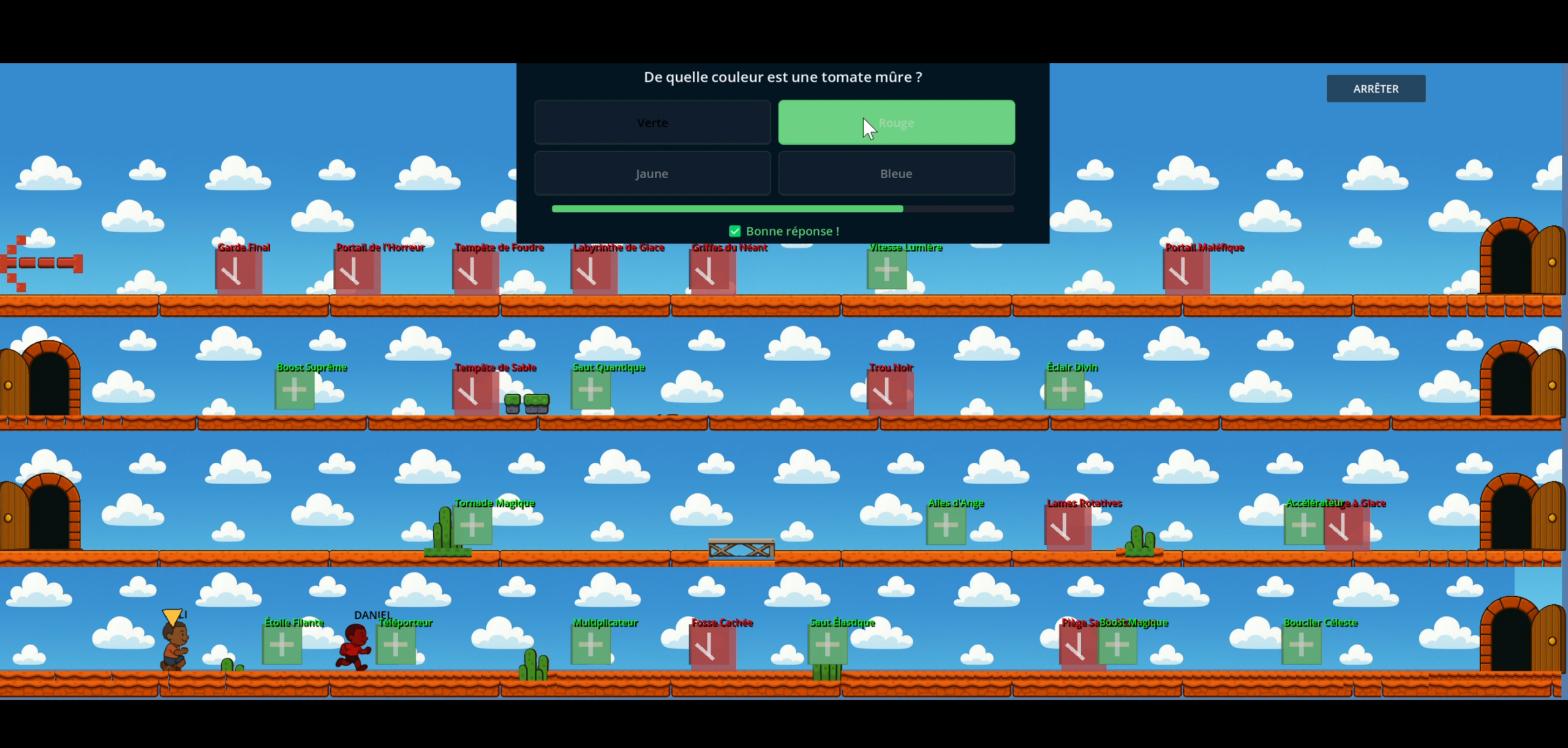 C’est un jeu éducatif 2D développé avec Godot 4.4, où le joueur progresse dans un niveau en répondant à des questions de culture générale (QCM). À chaque bonne réponse, il avance case par case sur la carte ; des pièges le font reculer, des bonus l’accélèrent.