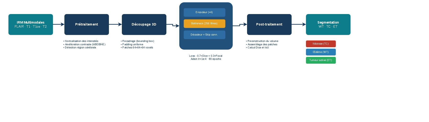 L’objectif de ce travail est de développer un modèle de deep learning capable de segmenter les différentes régions tumorales (nécrose, œdème et tumeur active) de manière automatique et fiable. Pour cela, un pipeline complet a été mis en place, incluant le prétraitement des images (normalisation, amélioration du contraste, recadrage) ainsi que le découpage en volumes 3D de taille 64×64×64.