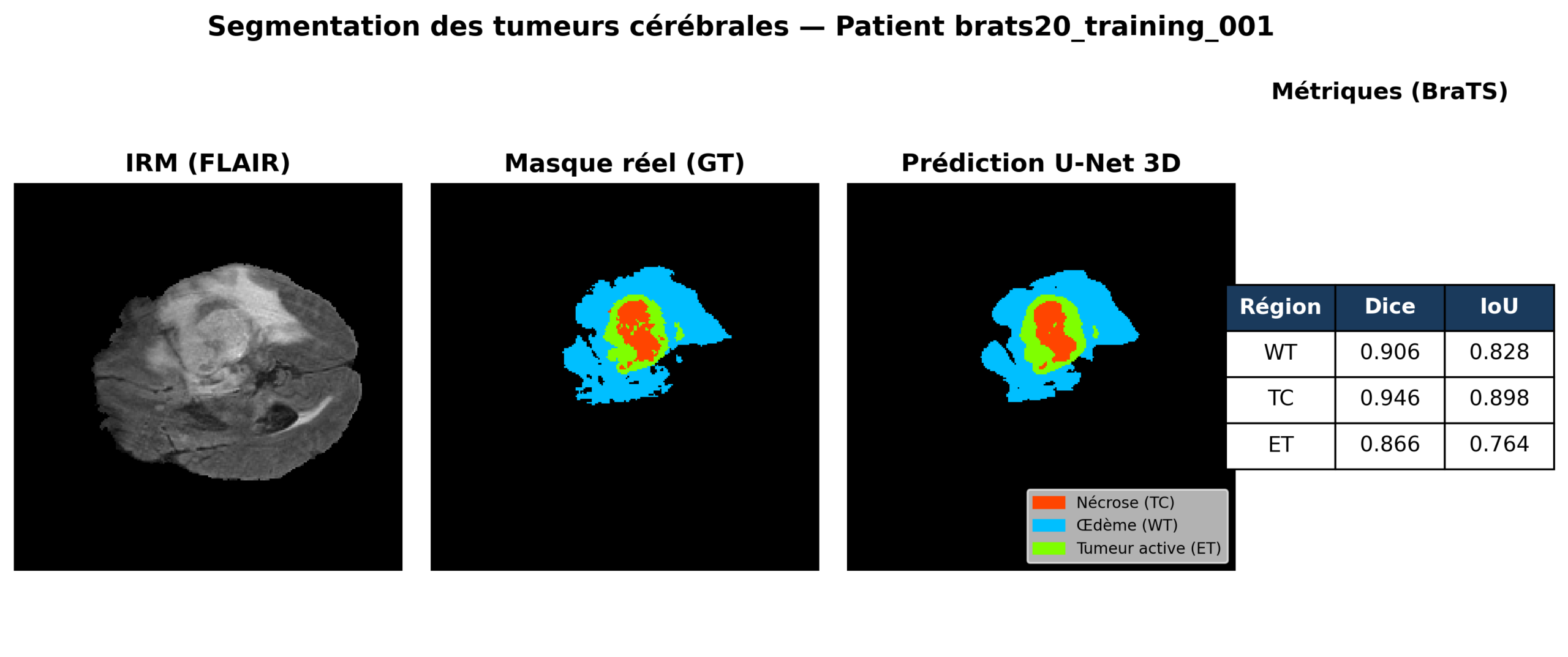 Les performances sont évaluées à l’aide des métriques officielles du challenge BraTS (Dice coefficient), avec des résultats de 0.83 pour la tumeur complète (WT), 0.72 pour le cœur tumoral (TC) et 0.73 pour la tumeur active (ET), indiquant des performances globalement satisfaisantes.