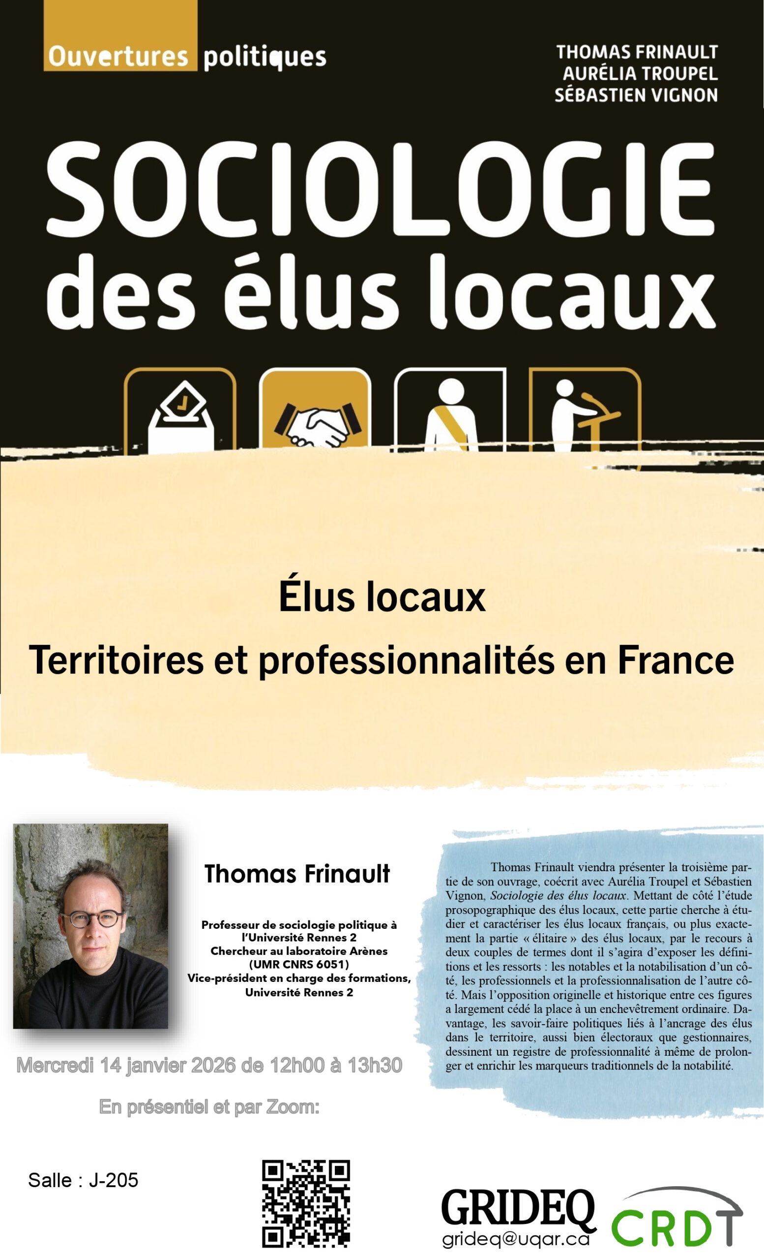 Le GRIDEQ en collaboration avec le CRDT vous invite à une conférence de Thomas FRINAULT, Professeur de sociologie politique à l’Université Rennes 2, sous le thème: Élus locaux, territoires et professionnalités en France